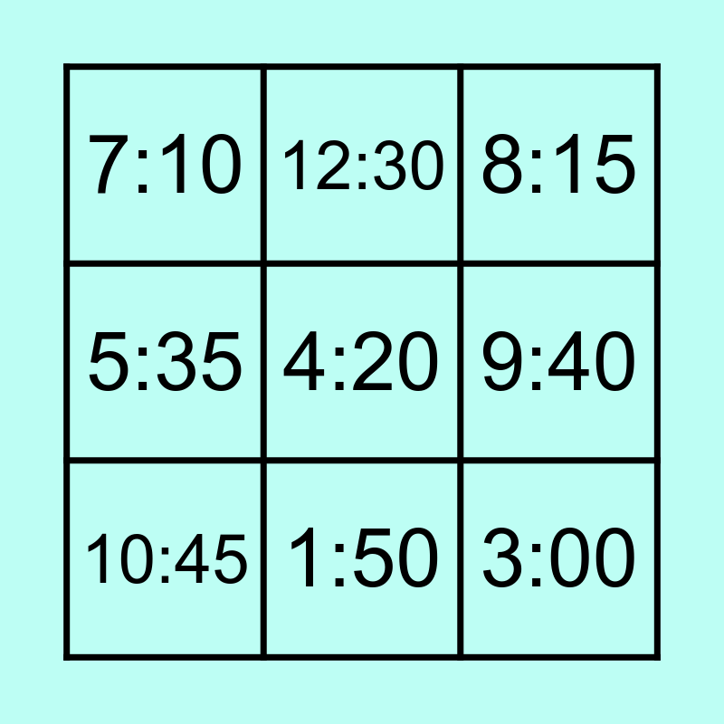 This bingo card has 9 words: 10:45, 8:15, 12:30, 5:35, 7:10, 9:40, 4:20, 3:00 and 1:50.