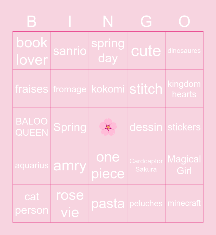 This bingo card has a free space and 24 words: amry, rose vie, kokomi, cat person, dinosaures, book lover, fraises, sanrio, dessin, one piece, stitch, BALOO QUEEN, Cardcaptor Sakura, Magical Girl, fromage, peluches, stickers, spring day, kingdom hearts, Spring, minecraft, aquarius, cute and pasta.