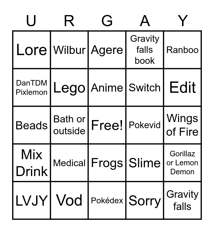 This bingo card has a free space and 24 words: Medical, Vod, Anime, LVJY, Ranboo, Lore, DanTDM Pixlemon, Wilbur, Pokevid, Frogs, Switch, Beads, Slime, Gorillaz or Lemon Demon, Lego, Sorry, Wings of Fire, Agere, Edit, Bath or outside, Gravity falls, Mix Drink, Gravity falls book and Pokédex.