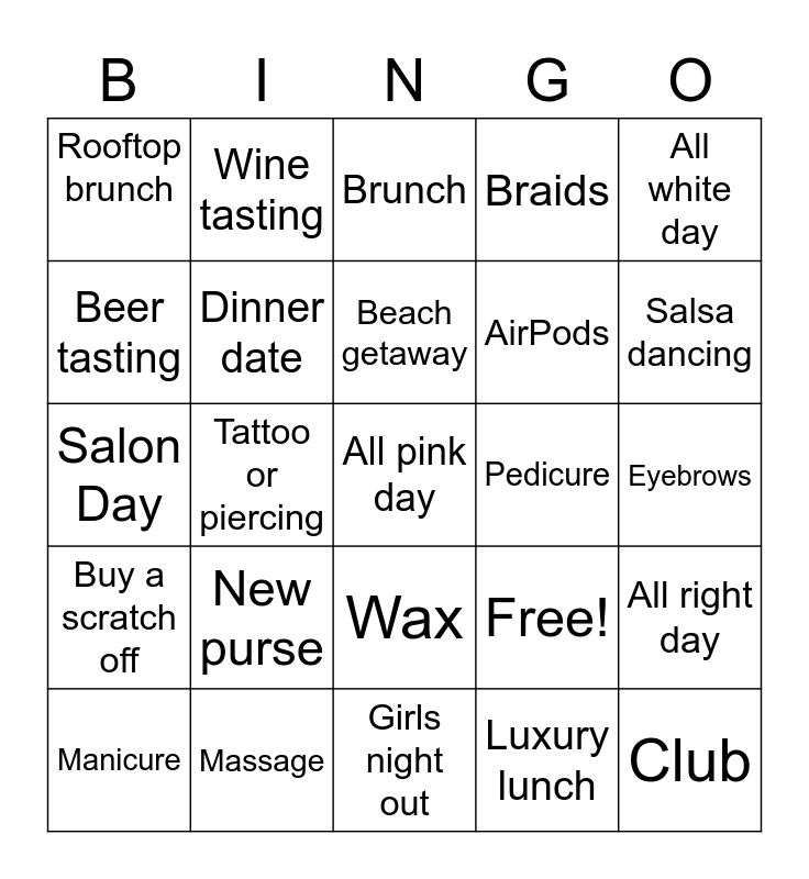 This bingo card has 25 words: New purse, Girls night out, Beach getaway, Manicure, All white day, Rooftop brunch, Beer tasting, Wine tasting, Pedicure, Wax, AirPods, Salon Day, Free!, All right day, Dinner date, Club, Eyebrows, Brunch, Salsa dancing, Tattoo or piercing, All pink day, Massage, Buy a scratch off, Braids and Luxury lunch.