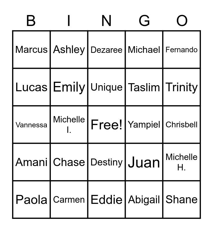 This bingo card has a free space and 110 words: Terrence, Honestii, Yampiel, Jean (Alex), Ruby, Derek, Yeida, Rayven, Arlette M, Yocasta, Emmy, Serina, Afsana, Alexis, Bruno, Lia, Vannessa, Deja, Alaya, Marlainia, Michelle H., Edwin, Nathaniel K., Lacey, Gabriel, Unique, Fernando, Xavier, Mia, Julianna, Trinity, Michael, Dezaree, Cassidi, Kayla, Shane, Nathan C., Joanis M., Carmen, Devon, Zada, Stephanie, Taslim, Michelle I., Juan, Aalexis, Gerelyn, Donasia, Mya, Samantha, London, Sebastian, Abigail, Ni'lee, Madyson, Emely, Ja'Nia, Courtney, Khora, Emily, Marcus, Paige, Cayden, Joannis G., Omar, Chase, Hamzah, Maria, David, Bre'Ajah, Autumn, Esmeralda, Ashley, Ashanti, Frangely, Kaylee, Nataly, Chrisbell, Bronson, Joe, Sky-Lee, Liam, Nicole, Ben O., Adrian, Julio, Kheylian, Ashiya, Christianna, Balerin, Anais, Lucas, Isaac, Amani, Brian, Alejandra, Arlette G., Frida, Ben C., Eddie, Erica, William, Cindell, Paola, Destiny, Jose, Elyzabeth, Amya, Kylie and Destiny P..