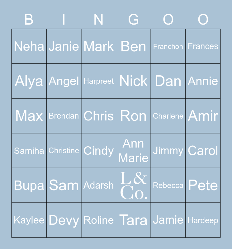 This bingo card has 1 images and 35 words: Adarsh, Tara, Alya, Samiha, Ron, Angel, Roline, Franchon, Rebecca, Annie, Ben, Pete, Brendan, Nick, Neha, Bupa, Charlene, Max, Mark, Chris, Christine, Ann Marie, Cindy, Jimmy, Janie, Dan, Devy, Harpreet, Frances, Hardeep, Kaylee, Carol, Amir, Sam and Jamie.