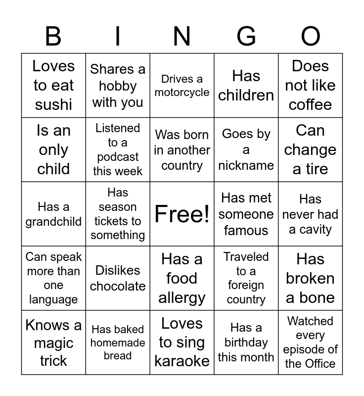 This bingo card has a free space and 59 words: Played a sport in college, Has baked homemade bread, Is left handed, Can speak more than one language, Has a birthday this month, Enjoys spicy food, Listened to a podcast this week, Worked here more than 10 years, Goes by a nickname, Can drive a stick shift, Has children, Can play a musical instrument, Is an only child, Never been to a Disney park, Has run a 10k or longer, Loves to eat sushi, Watched every episode of the Office, Does not like coffee, Has multiple pets, Was born in another country, Has met someone famous, Drives a motorcycle, Knows a magic trick, Has broken a bone, Has a pool, Has won a competition, Has a blue car, Has been to the beach this week, Can change a tire, Can play an instrument, Has read a book this month, Is vegetarian, Has a garden, Can do a handstand, Shares a hobby with you, Lives in a different state than you, Has visited 10+ National Parks, Has season tickets to something, Has gone skiing in the last week, Has a grandchild, Has been to the movies this month, Dislikes chocolate, Has never had a cavity, Loves baseball, Has moved less than 3 times, Plays a sport on the weekend, Has a tattoo, Has had braces, Has a food allergy, Loves to sing karaoke, Has never seen a Star Wars movie, Has lived in another country, Watches reality TV, Made a New Year's resolution and kept it, Is afraid of spiders, Traveled to a foreign country, Can juggle, Has saved a life and Has been in a band.