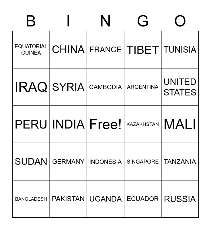 This bingo card has a free space and 24 words: BANGLADESH, GERMANY, CAMBODIA, ECUADOR, TUNISIA, EQUATORIAL GUINEA, CHINA, FRANCE, KAZAKHSTAN, MALI, PERU, SYRIA, SINGAPORE, TANZANIA, IRAQ, PAKISTAN, UGANDA, TIBET, UNITED STATES, SUDAN, INDIA, INDONESIA, ARGENTINA and RUSSIA.