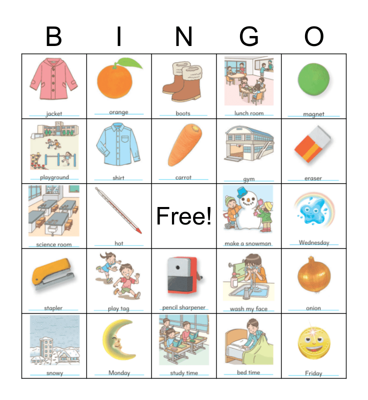 This bingo card has 29 images and a free space.