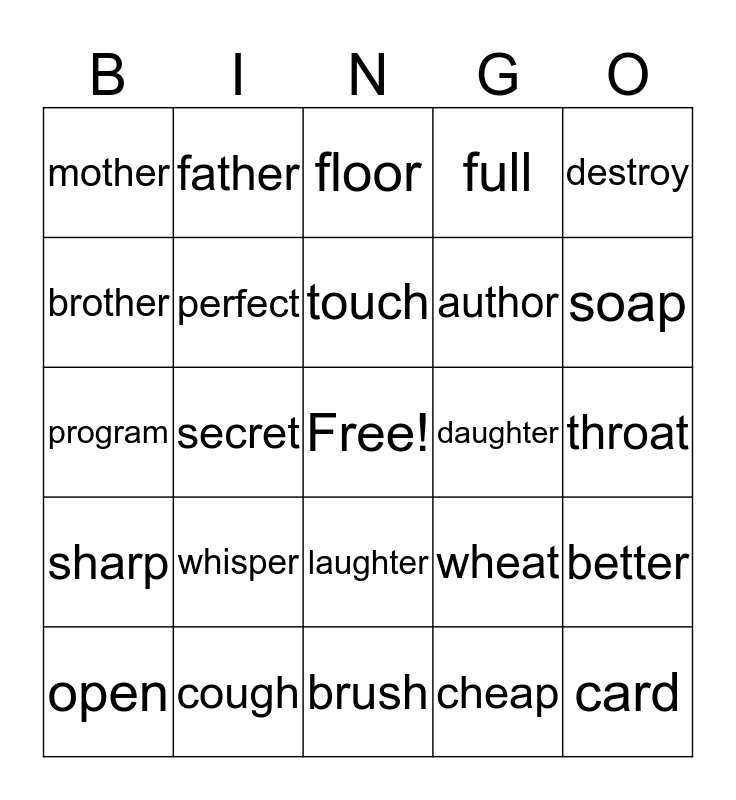 This bingo card has a free space and 24 words: whisper, cough, touch, open, destroy, mother, brother, father, daughter, laughter, author, program, wheat, better, perfect, cheap, throat, floor, soap, secret, card, sharp, full and brush.