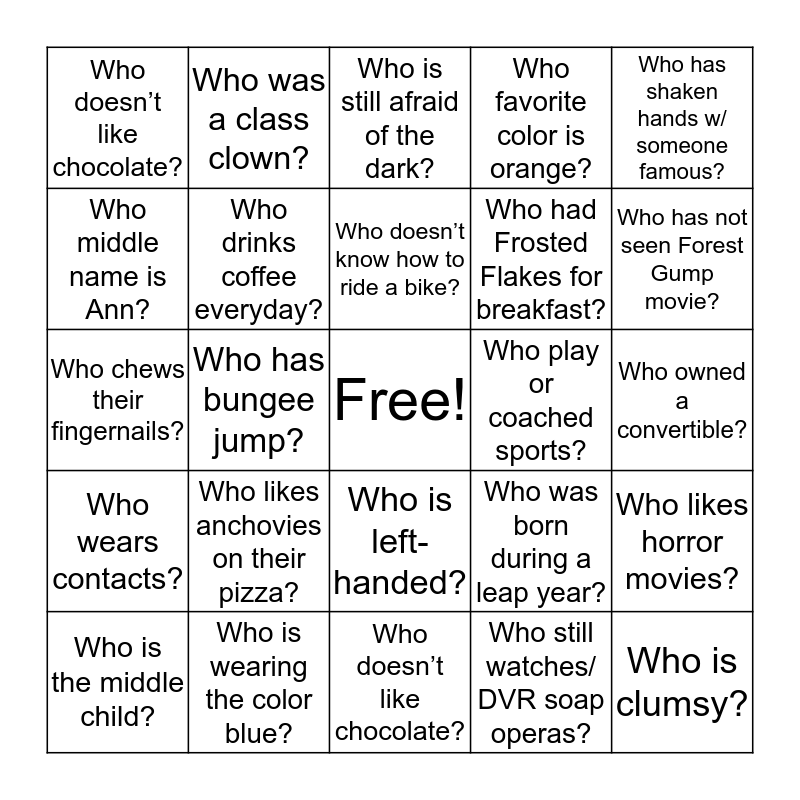 This bingo card has a free space and 24 words: Who likes anchovies on their pizza?, Who is wearing the color blue?, Who doesn’t know how to ride a bike?, Who is the middle child?, Who has shaken hands w/ someone famous?, Who doesn’t like chocolate?, Who middle name is Ann?, Who was a class clown?, Who play or coached sports?, Who is left-handed?, Who had Frosted Flakes for breakfast?, Who chews their fingernails?, Who was born during a leap year?, Who likes horror movies?, Who drinks coffee everyday?, Who still watches/ DVR soap operas?, Who owned a convertible?, Who is still afraid of the dark?, Who has not seen Forest Gump movie?, Who has bungee jump?, Who is clumsy?, Who wears contacts?, Who favorite color is orange? and Who doesn’t like chocolate?.