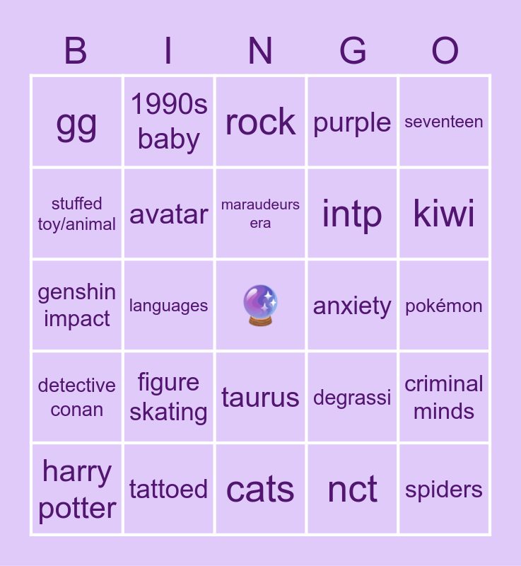 This bingo card has a free space and 24 words: harry potter, figure skating, maraudeurs era, nct, seventeen, gg, 1990s baby, rock, anxiety, pokémon, genshin impact, avatar, degrassi, criminal minds, stuffed toy/animal, tattoed, cats, purple, kiwi, detective conan, languages, taurus, intp and spiders.