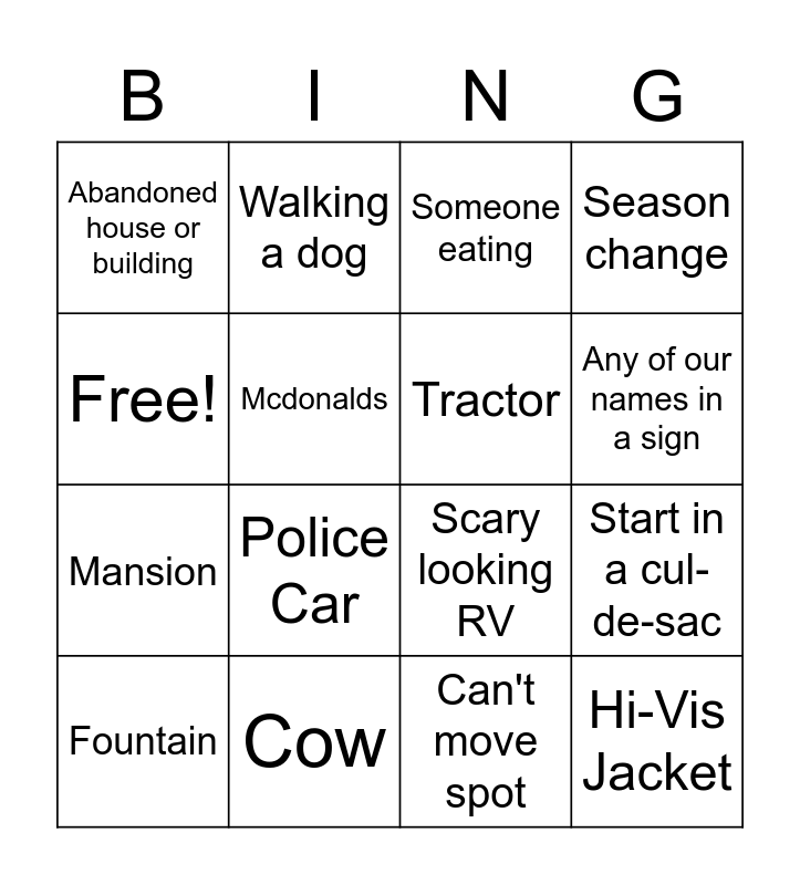 This bingo card has 16 words: Cow, Start in a cul-de-sac, Someone eating, Abandoned house or building, Mansion, Walking a dog, Scary looking RV, Can't move spot, Free!, Mcdonalds, Fountain, Season change, Police Car, Any of our names in a sign, Tractor and Hi-Vis Jacket.