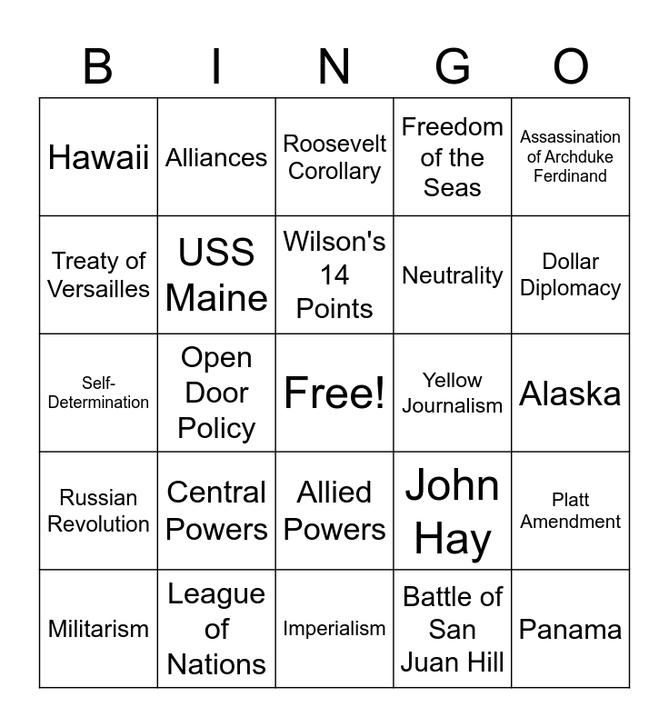 This bingo card has a free space and 31 words: Imperialism, Woodrow Wilson, Open Door Policy, Japan, Hawaii, Roosevelt Corollary, USS Maine, John Hay, Yellow Journalism, Battle of San Juan Hill, Alaska, Panama, Zimmerman Note, Guam, Puerto Rico, Philippines, Dollar Diplomacy, German Unrestricted Submarine Warfare, Platt Amendment, Central Powers, Russian Revolution, Allied Powers, Assassination of Archduke Ferdinand, Nationalism, Militarism, Alliances, Neutrality, Treaty of Versailles, Freedom of the Seas, Self-Determination, League of Nations, Wilson's 14 Points and Mandate System.