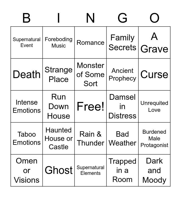 This bingo card has a free space and 24 words: Haunted House or Castle, Ghost, Monster of Some Sort, Omen or Visions, A Grave, Supernatural Event, Death, Foreboding Music, Damsel in Distress, Rain & Thunder, Ancient Prophecy, Intense Emotions, Bad Weather, Burdened Male Protagonist, Strange Place, Trapped in a Room, Unrequited Love, Romance, Curse, Run Down House, Dark and Moody, Taboo Emotions, Family Secrets and Supernatural Elements.