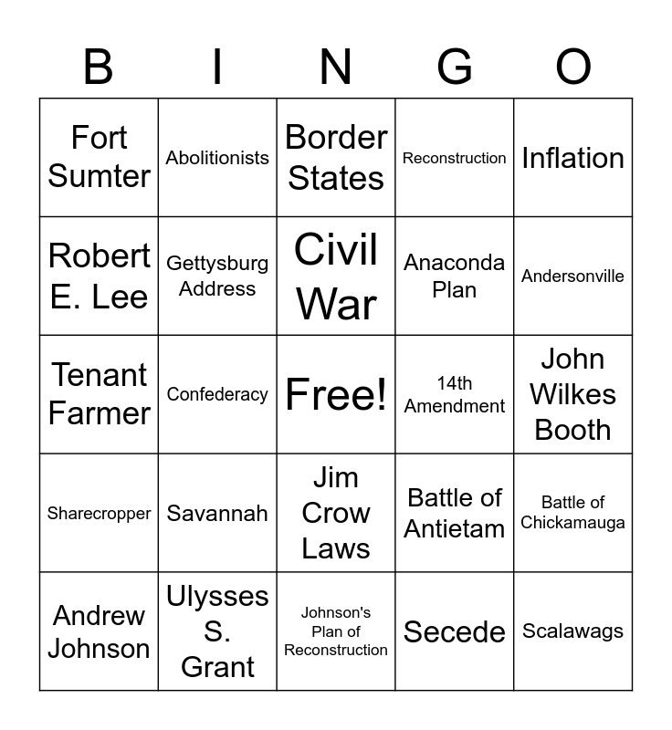 This bingo card has a free space and 44 words: Slaves, Scalawags, North, Andrew Johnson, Radical Republicans, Secede, Border States, Antebellum, Inflation, Ulysses S. Grant, Reconstruction, 14th Amendment, Jim Crow Laws, Savannah, Blockade Runners, Johnson's Plan of Reconstruction, 15th Amendment, Tenant Farmer, Milledgeville, Andersonville, Abolitionists, Congressional Plan of Reconstruction, Lincoln's Plan of Reconstruction, Fort Sumter, 13th Amendment, John Wilkes Booth, Battle of Gettysburg, Carpetbagger, Battle of Antietam, Sharecropper, Ku Klux Klan, Battle of Chickamauga, Union, South, Confederacy, Freedmen's Bureau, Emancipation Proclamation, William T. Sherman, Civil War, Robert E. Lee, Anaconda Plan, Popular Sovereignty, Gettysburg Address and Henry Wirz.