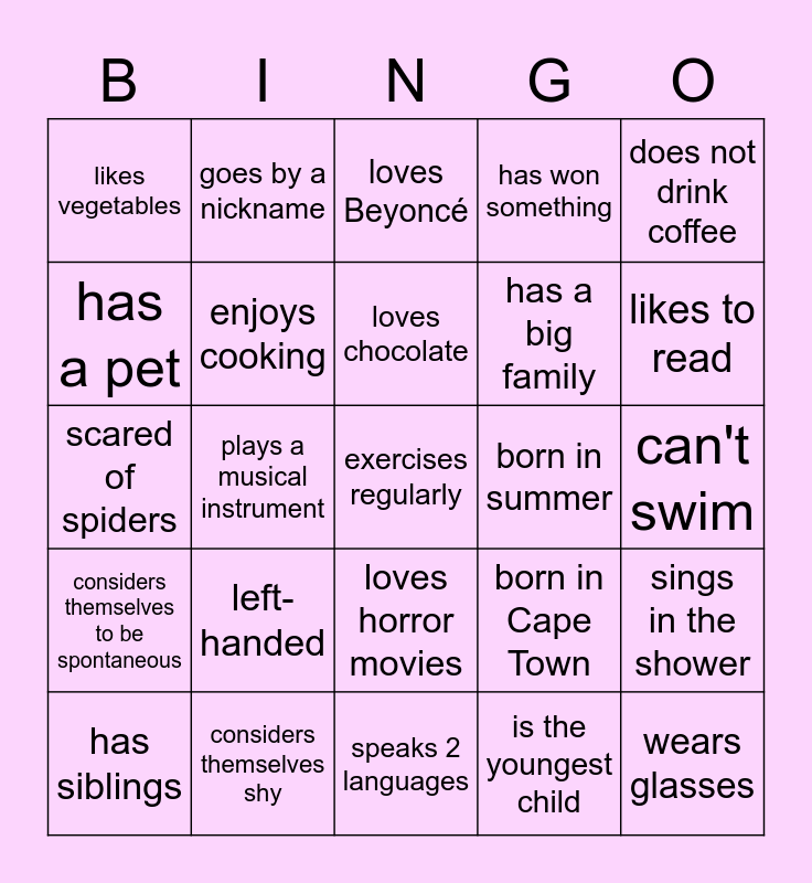 This bingo card has a free space and 24 words: left-handed, considers themselves shy, loves chocolate, has siblings, does not drink coffee, likes vegetables, has a pet, goes by a nickname, born in summer, loves horror movies, has a big family, scared of spiders, born in Cape Town, sings in the shower, enjoys cooking, is the youngest child, can't swim, loves Beyoncé, likes to read, plays a musical instrument, wears glasses, considers themselves to be spontaneous, has won something and speaks 2 languages.