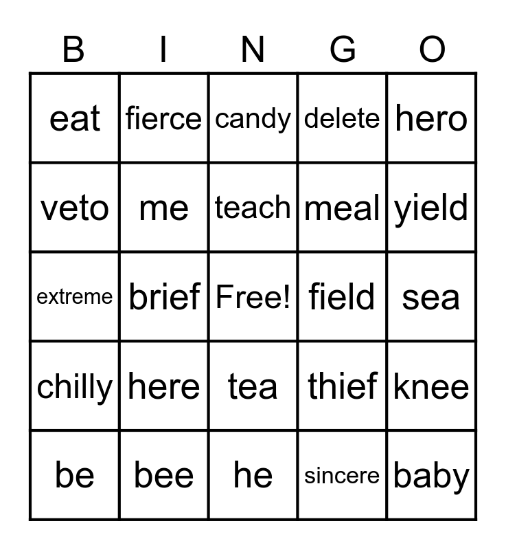 This bingo card has a free space and 29 words: be, these, brief, see, eat, candy, me, here, field, bee, sea, baby, he, sincere, yield, meet, tea, chilly, hero, extreme, thief, teen, meal, veto, delete, fierce, knee, teach and evil.