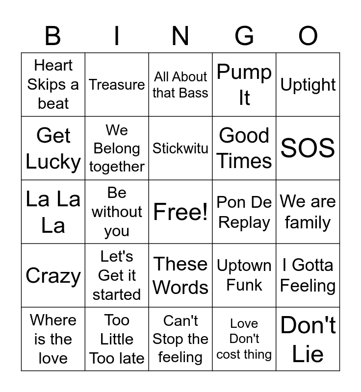 This bingo card has a free space and 27 words: Uptown Funk, Happy, Good Times, Can't Stop the feeling, Get Lucky, All About that Bass, Treasure, Crazy, Pon De Replay, I Gotta Feeling, La La La, Pump It, Where is the love, Too Little Too late, SOS, Men In Black, We Belong together, Stickwitu, Let's Get it started, Heart Skips a beat, We are family, Love Don't cost thing, Be without you, Don't Lie, These Words, Uptight and ABC.