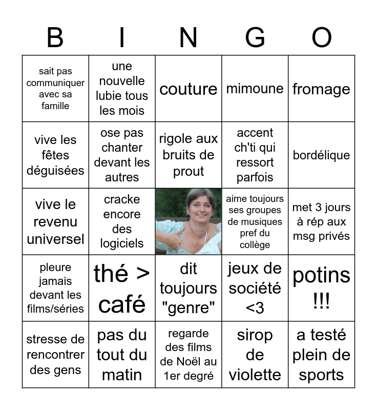 This bingo card has a free space and 24 words: thé > café, pas du tout du matin, rigole aux bruits de prout, stresse de rencontrer des gens, fromage, sait pas communiquer avec sa famille, vive les fêtes déguisées, une nouvelle lubie tous les mois, aime toujours ses groupes de musiques pref du collège, dit toujours "genre", accent ch'ti qui ressort parfois, vive le revenu universel, jeux de société <3, potins !!!, ose pas chanter devant les autres, sirop de violette, met 3 jours à rép aux msg privés, couture, bordélique, cracke encore des logiciels, a testé plein de sports, pleure jamais devant les films/séries, mimoune and regarde des films de Noël au 1er degré.