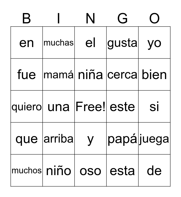 This bingo card has a free space and 31 words: oso, un, una, es, en, el, mamá, papá, este, esta, si, de, no, la, bien, vive, juega, arriba, que, y, yo, hay, muchos, muchas, cerca, fue, gusta, quiero, niño, niña and kilo.