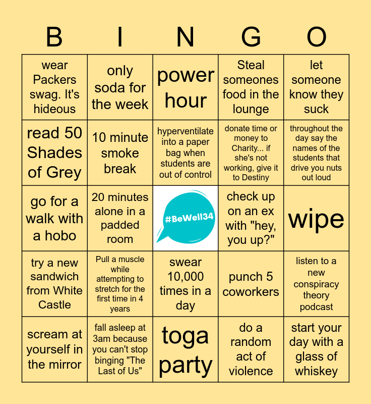 This bingo card has a free space and 24 words: Pull a muscle while attempting to stretch for the first time in 4 years, fall asleep at 3am because you can't stop binging "The Last of Us", hyperventilate into a paper bag when students are out of control, scream at yourself in the mirror, let someone know they suck, wear Packers swag. It's hideous, read 50 Shades of Grey, only soda for the week, check up on an ex with "hey, you up?", swear 10,000 times in a day, donate time or money to Charity... if she's not working, give it to Destiny, go for a walk with a hobo, punch 5 coworkers, listen to a new conspiracy theory podcast, 10 minute smoke break, do a random act of violence, wipe, power hour, throughout the day say the names of the students that drive you nuts out loud, 20 minutes alone in a padded room, start your day with a glass of whiskey, try a new sandwich from White Castle, Steal someones food in the lounge and toga party.