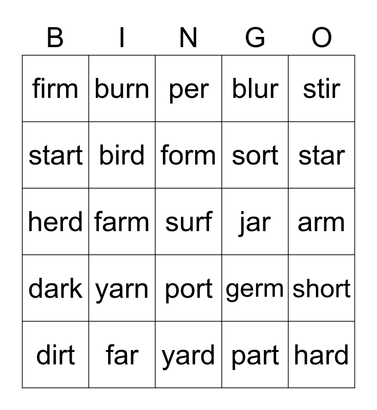 This bingo card has 25 words: yarn, yard, form, dirt, stir, firm, start, burn, jar, port, sort, herd, germ, short, bird, hard, arm, per, star, farm, surf, far, dark, blur and part.