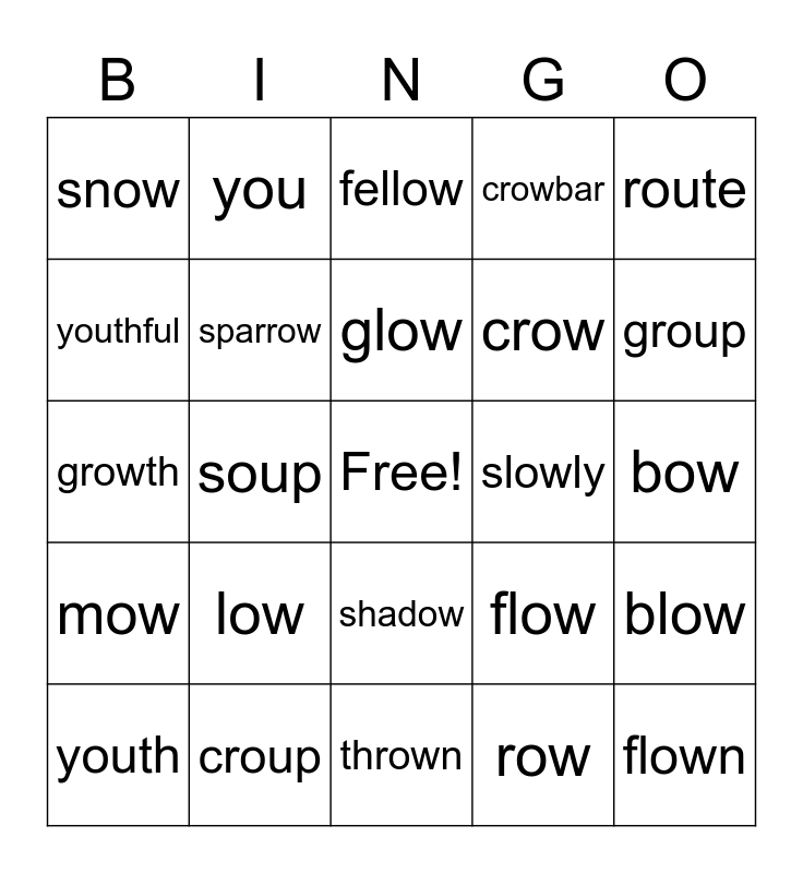 This bingo card has a free space and 24 words: low, croup, glow, youth, route, snow, youthful, you, slowly, shadow, crow, growth, flow, blow, sparrow, row, bow, fellow, group, soup, flown, mow, crowbar and thrown.