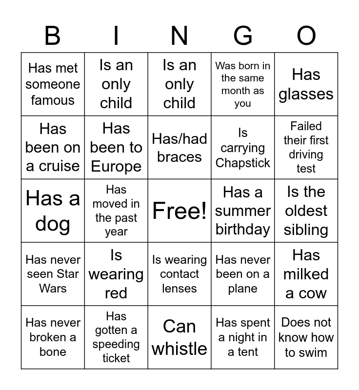 This bingo card has a free space and 79 words: Speaks more than 2 languages, Likes pineapple on pizza, Is an only child, Can play multiple instruments, Shares your taste in music, Is left-handed, Has been to more than two countries, Likes to bake, Has the same favorite food as you, Has an allergy, Knows what career they want, Has been to more than three states, Was born in the same month as you, Has met someone famous, Has been to multiple concerts, Has been on a cruise, Has gone camping, Is wearing red, Likes really spicy food, Is the oldest sibling, Likes skiing/snowboarding, Has glasses, Has a dog, Has/had braces, Has been to Europe, Has a pet other than cat/dog, Had braces, Has a home-based business, Is left-handed, Can play a musical instrument, Failed their first driving test, Has more than three children, Can whistle, Can use chopsticks, Has never broken a bone, Has a summer birthday, Has ridden a motorcycle, Is afraid of spiders, Has changed a tire, Does not know how to swim, Is fluent in another language, Has a birthday on a holiday, Has been skydiving, Is taking a class right now, Has met a celebrity, Is an only child, Is allergic to cats, Is a vegetarian, Does Yoga, Has been published, Has milked a cow, Has moved in the past year, Has never been on a plane, Has slept overnight on a beach, Has never been outside the US, Has blue eyes, Can do a cartwheel, Has a tattoo, Has been in a play, Is wearing contact lenses, Is carrying Chapstick, Has sung karaoke, Has been on a cruise, Has had stitches, Has been on a horse, Can juggle, Can roller skate, Has run a marathon, Has quit smoking, Has never seen Star Wars, Has gotten a speeding ticket, Has worked at Norwescap 5+ years, Has caught a fish, Is not on Facebook, Has had their tonsils out, Has spent a night in a tent, Does needlework, Has been to a pro sports game and Can name all 7 dwarves.