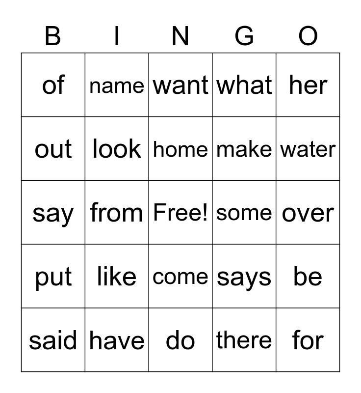 This bingo card has a free space and 24 words: like, have, home, said, her, of, out, name, some, come, make, say, says, be, look, there, over, want, water, from, for, put, what and do.
