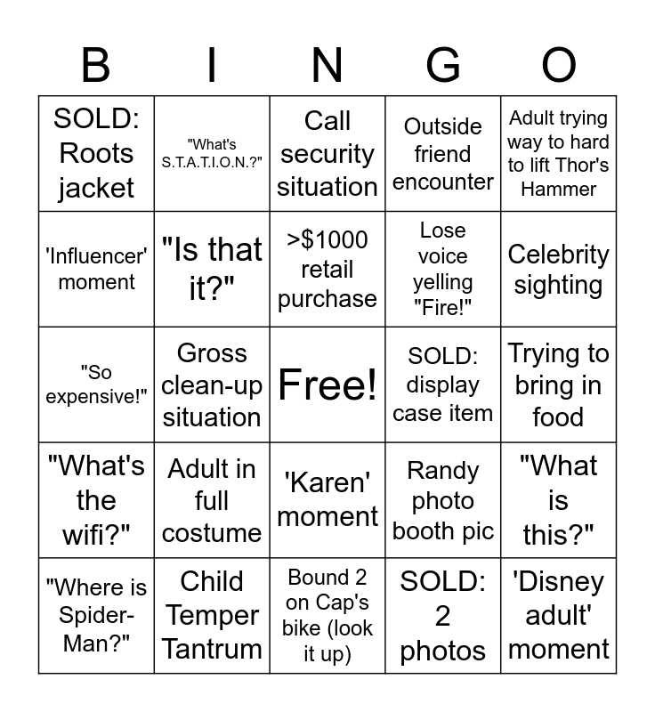 This bingo card has a free space and 24 words: Adult in full costume, Child Temper Tantrum, >$1000 retail purchase, "Where is Spider-Man?", Adult trying way to hard to lift Thor's Hammer, SOLD: Roots jacket, 'Influencer' moment, "What's S.T.A.T.I.O.N.?", SOLD: display case item, 'Karen' moment, Lose voice yelling "Fire!", "So expensive!", Randy photo booth pic, "What is this?", "Is that it?", SOLD: 2 photos, Trying to bring in food, Call security situation, Celebrity sighting, Gross clean-up situation, 'Disney adult' moment, "What's the wifi?", Outside friend encounter and Bound 2 on Cap's bike (look it up).