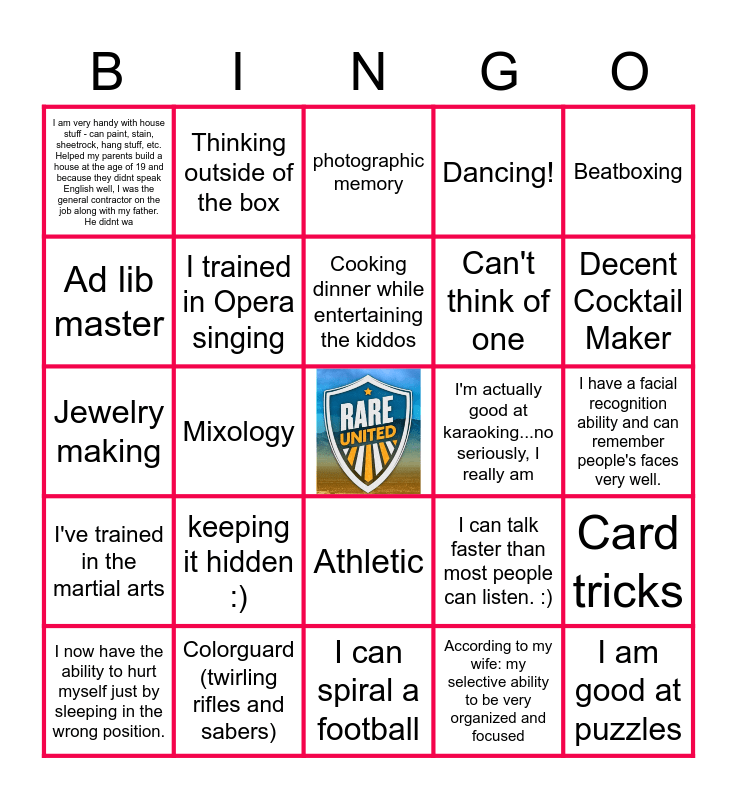This bingo card has a free space and 24 words: keeping it hidden :), Colorguard (twirling rifles and sabers), Cooking dinner while entertaining the kiddos, I now have the ability to hurt myself just by sleeping in the wrong position., Beatboxing, I am very handy with house stuff - can paint, stain, sheetrock, hang stuff, etc. Helped my parents build a house at the age of 19 and because they didnt speak English well, I was the general contractor on the job along with my father. He didnt wa, Ad lib master, Thinking outside of the box, I'm actually good at karaoking...no seriously, I really am, Athletic, Can't think of one, Jewelry making, I can talk faster than most people can listen. :), Card tricks, I trained in Opera singing, According to my wife: my selective ability to be very organized and focused, I have a facial recognition ability and can remember people's faces very well., photographic memory, Decent Cocktail Maker, Mixology, I am good at puzzles, I've trained in the martial arts, Dancing! and I can spiral a football.