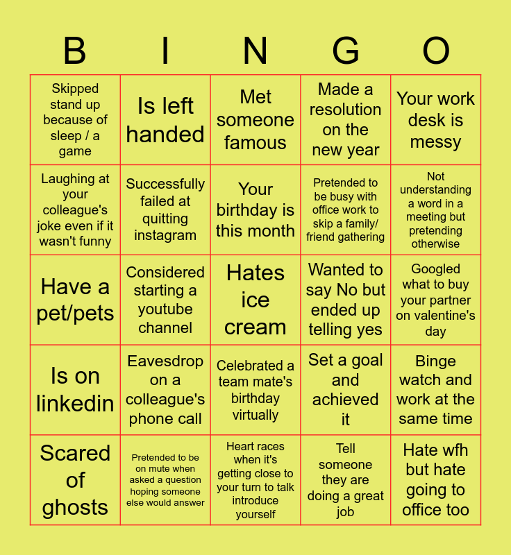 This bingo card has 25 words: Eavesdrop on a colleague's phone call, Heart races when it's getting close to your turn to talk introduce yourself, Your birthday is this month, Scared of ghosts, Your work desk is messy, Skipped stand up because of sleep / a game, Laughing at your colleague's joke even if it wasn't funny, Is left handed, Wanted to say No but ended up telling yes, Celebrated a team mate's birthday virtually, Pretended to be busy with office work to skip a family/ friend gathering, Have a pet/pets, Set a goal and achieved it, Binge watch and work at the same time, Successfully failed at quitting instagram, Hate wfh but hate going to office too, Googled what to buy your partner on valentine's day, Met someone famous, Not understanding a word in a meeting but pretending otherwise, Considered starting a youtube channel, Hates ice cream, Pretended to be on mute when asked a question hoping someone else would answer, Is on linkedin, Made a resolution on the new year and Tell someone they are doing a great job.