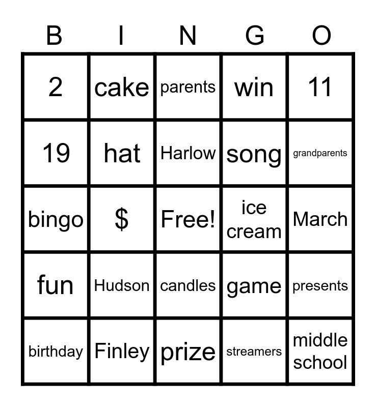 This bingo card has a free space and 24 words: Hudson, Finley, Harlow, birthday, 11, 2, 19, cake, ice cream, candles, song, bingo, game, presents, hat, streamers, March, parents, grandparents, $, middle school, fun, win and prize.