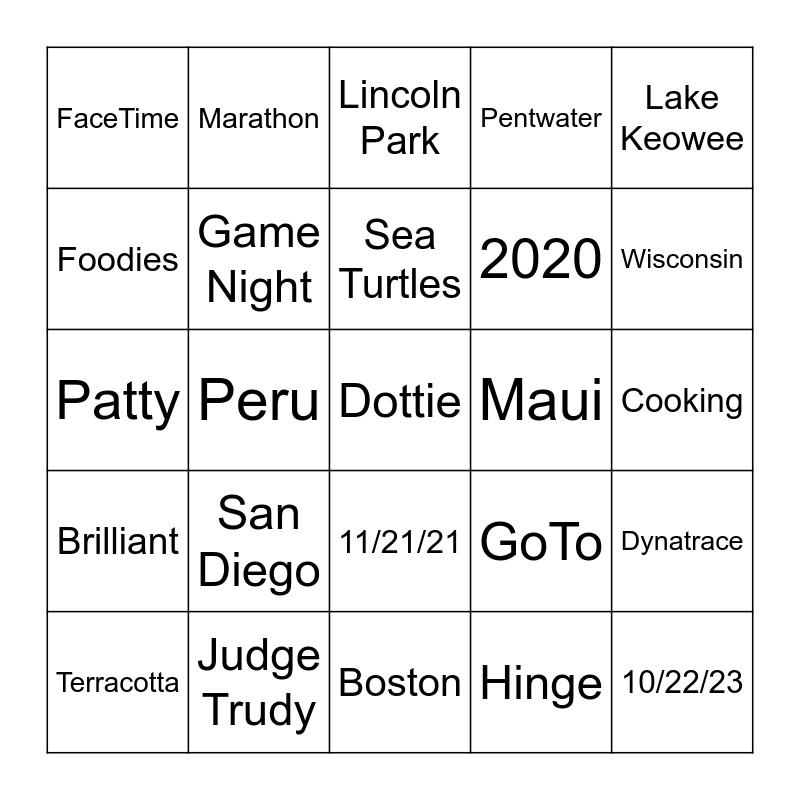 This bingo card has 50 words: Puzzles, Dottie, Chicago, Boston, San Diego, Boxed and Burlap, Marathon, Swimming, Foodies, Crumbl Cookies, Game Night, Pentwater, Dynatrace, GoTo, Marketing, Information systems, Sea Turtles, Maui, Pensacola, Lake Keowee, Peru, Hinge, FaceTime, 2020, October, 10/22/23, Wisconsin, Golden Retriever, Lincoln Park, 11/21/21, Blue Heels, CrossFit, Improv, Alicia Keys, Judge Trudy, Omakase, Wheaton, Traverse City, Lake Geneva, Cooking, FoodNotWork, Donuts, Marvel, Navy Blue, Terracotta, Patty, New England IPA, 28, Brilliant and Emerald.