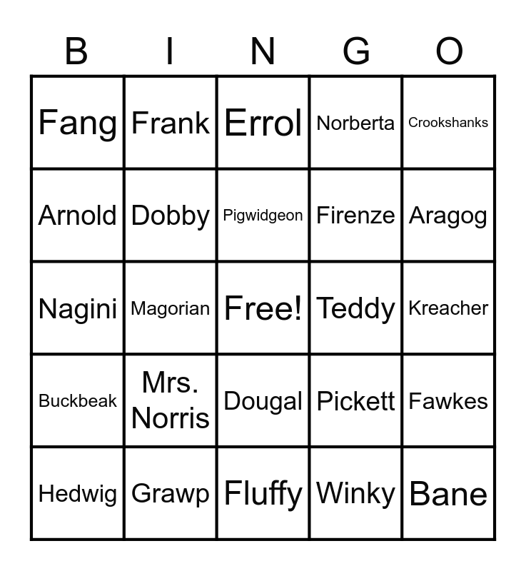 This bingo card has a free space and 24 words: Mrs. Norris, Grawp, Pigwidgeon, Hedwig, Crookshanks, Fang, Arnold, Frank, Teddy, Dougal, Firenze, Nagini, Pickett, Fawkes, Dobby, Winky, Kreacher, Errol, Aragog, Magorian, Bane, Buckbeak, Norberta and Fluffy.