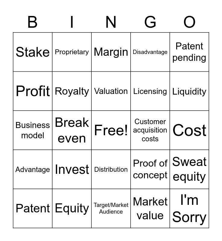 This bingo card has a free space and 24 words: Invest, Equity, Valuation, Patent, Patent pending, Stake, Profit, Proprietary, Customer acquisition costs, Distribution, Licensing, Business model, Proof of concept, Sweat equity, Royalty, Market value, Cost, Margin, Liquidity, Break even, I'm Sorry, Advantage, Disadvantage and Target/Market Audience.