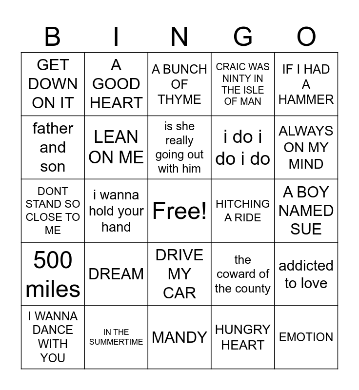 This bingo card has a free space and 43 words: I LEFT MY HEART IN SAN FRANCISCO, EMOTION, JUST HAVENT MET YOU YET, I WANNA DANCE WITH YOU, FOR ONCE IN MY LIFE, HUNGRY HEART, A BUNCH OF THYME, DONT GIVE UP ON US BABY, IF I HAD A HAMMER, IN THE SUMMERTIME, CRAIC WAS NINTY IN THE ISLE OF MAN, HITCHING A RIDE, DRIVE MY CAR, DREAM, AMERICA, MANDY, JUST CANT HELP BELIEVIN, DONT STAND SO CLOSE TO ME, THE EYE OF THE TIGER, ALWAYS ON MY MIND, A GOOD HEART, HEY MICKEY, SOUND OF SILENCE, GET DOWN ON IT, SONG FOR IRELAND, A BOY NAMED SUE, alone, i will, the coward of the county, 500 miles, cant smile without you, addicted to love, HIGH HOPES, i wanna hold your hand, its all over now, daydream believer, friday im in love, is she really going out with him, father and son, i do i do i do, EASY, LEAN ON ME and HOLLWOOD.