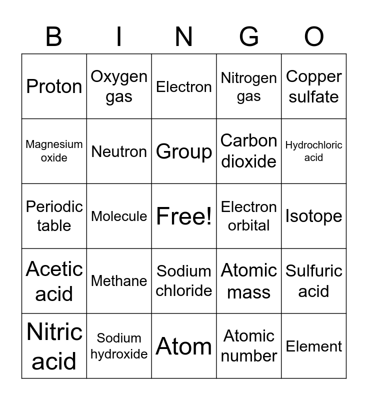 This bingo card has a free space and 31 words: Atom, Compound, Molecule, Nucleus, Proton, Electron, Neutron, Atomic mass, Electron orbital, Atomic number, Isotope, Element, Subscript, Number of atoms, Hydrochloric acid, Glucose, Sulfuric acid, Methane, Acetic acid, Sodium chloride, Copper sulfate, Calcium carbonate, Nitric acid, Oxygen gas, Carbon dioxide, Magnesium oxide, Nitrogen gas, Periodic table, Sodium hydroxide, Group and Period.