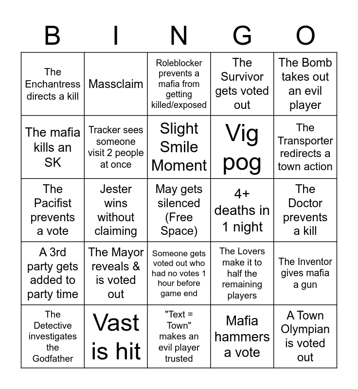 This bingo card has a free space and 24 words: The Detective investigates the Godfather, The Mayor reveals & is voted out, Slight Smile Moment, Mafia hammers a vote, The Bomb takes out an evil player, The Enchantress directs a kill, Massclaim, Roleblocker prevents a mafia from getting killed/exposed, 4+ deaths in 1 night, The Doctor prevents a kill, The Pacifist prevents a vote, Tracker sees someone visit 2 people at once, The Lovers make it to half the remaining players, The Inventor gives mafia a gun, The mafia kills an SK, Vast is hit, "Text = Town" makes an evil player trusted, The Survivor gets voted out, The Transporter redirects a town action, A 3rd party gets added to party time, Jester wins without claiming, Someone gets voted out who had no votes 1 hour before game end, Vig pog and A Town Olympian is voted out.