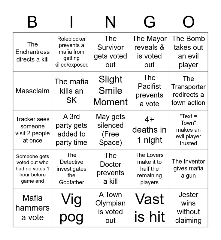 This bingo card has a free space and 24 words: The Detective investigates the Godfather, Vig pog, Slight Smile Moment, Mafia hammers a vote, The Bomb takes out an evil player, The Enchantress directs a kill, Massclaim, Roleblocker prevents a mafia from getting killed/exposed, 4+ deaths in 1 night, The Doctor prevents a kill, The Pacifist prevents a vote, Tracker sees someone visit 2 people at once, The Lovers make it to half the remaining players, The Inventor gives mafia a gun, The mafia kills an SK, Vast is hit, "Text = Town" makes an evil player trusted, The Survivor gets voted out, The Transporter redirects a town action, A 3rd party gets added to party time, Jester wins without claiming, Someone gets voted out who had no votes 1 hour before game end, The Mayor reveals & is voted out and A Town Olympian is voted out.