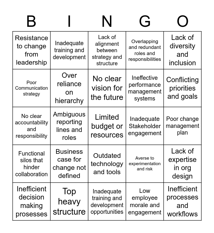 This bingo card has a free space and 24 words: Business case for change not defined, Top heavy structure, No clear vision for the future, Inefficient decision making prosesses, Lack of diversity and inclusion, Resistance to change from leadership, Poor Communication strategy, Inadequate training and development, Inadequate Stakeholder engagement, Outdated technology and tools, Ineffective performance management systems, No clear accountability and responsibility, Averse to experimentation and risk, Lack of expertise in org design, Over reliance on hierarchy, Low employee morale and engagement, Poor change management plan, Lack of alignment between strategy and structure, Conflicting priorities and goals, Ambiguous reporting lines and roles, Inefficient processes and workflows, Functional silos that hinder collaboration, Overlapping and redundant roles and responsibilities and Inadequate training and development opportunities.