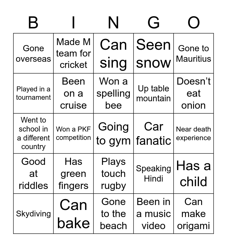 This bingo card has 55 words: Free!, Skydiving, Gone on a hike, Gone overseas, Gone to the beach, Ridden a horse, Been on a cruise, Birdwatching, Up table mountain, Midmar, Seen snow, Played sport on a national level, Broken a bone, Bunker jumped, Garden rout road trip, Swimming with sharks, Gone to Mauritius, Won a PKF competition, Been on the radio, Going to gym, Car fanatic, Archery, Speaking Hindi, Can sing, Married, Won a spelling bee, Been in a music video, Almost drowned, Near death experience, Has a child, Shave all of your hair, Hit a hole on one, Kzn colours, Been skiing, Played in a tournament, Went to school in a different country, Named after a celebrity, Good at riddles, Can make origami, Done karate, Made M team for cricket, Threw a stick very far, Part of an NPO, Engaged, Has green fingers, Can bake, Doesn’t eat vegetables, Eats brussel sprouts, Did acrobatics, Doesn’t eat onion, Has fake teeth, Son had skull reconstructive surgery, Can fix cars, Plays touch rugby and F1 fan.