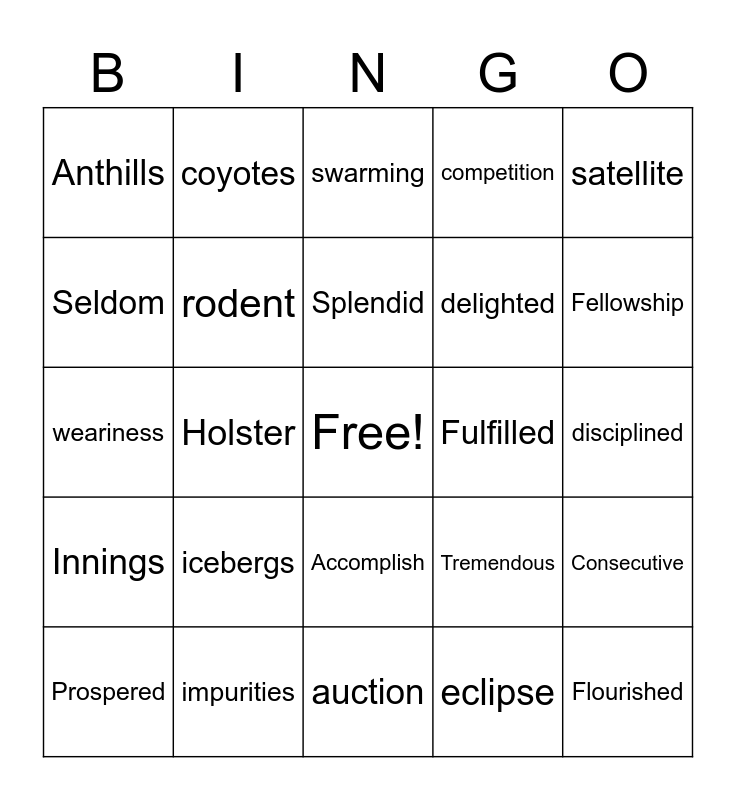 This bingo card has a free space and 96 words: Tirelessly, Holster, Belfry, Fulfilled, Impurities, Consecutive, contribution, consistent, cholera, canary, twelfth, entertainment, Convalescent, Fellowship, Civilian, Seldom, Splendid, Vultures, Caterpillar, Penguin, Amusement, amphibian, Icebergs, Perfection, Accomplish, auction, Lariat, Anthills, Extra-ordinary, Prodigy, Guava, Tremendous, Shredded, Stallion, satellite, surrender, Consecutive, corkscrew, Gobbled, Holster, Crockery, Prospered, Flourished, impurities, Innings, swarming, shuddered, Blacksmith, unusually, performance, posthumously, crescent, ministering, excellent, Opportunity, occasionally, prospered, gobbled, astonished, fellowship, autobiography, fierce, accomplish, poisonous, selflessness, Neighbour, enormous, established, emperor, eclipse, cocoon, nuisance, tremendous, championship, interestingly, Appetites, swineherd, rodent, communication, delighted, competition, revealed, monastery, Tradition, additional, weariness, icebergs, angrily, discovered, disciplined, Outstanding, opportunity, unstinting, revealed, coyotes and vaqueros.
