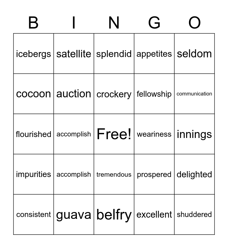 ⚠ This card has duplicate items: impurities (2), fellowship (2), icebergs (2), accomplish (2), tremendous (2), gobbled (2), prospered (2), opportunity (2)