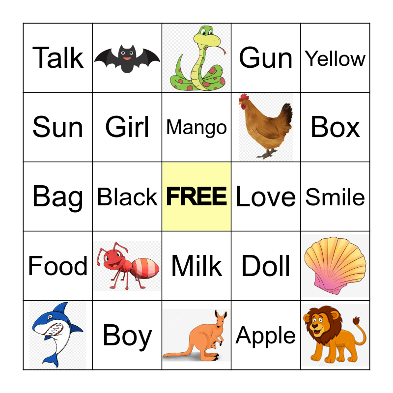 This bingo card has 8 images, a free space and 16 words: Boy, Mango, Yellow, Talk, Sun, Love, Milk, Bag, Doll, Girl, Apple, Smile, Box, Black, Food and Gun.