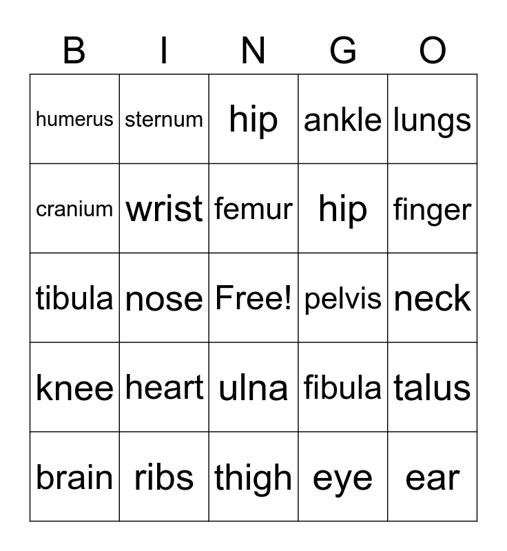 This bingo card has a free space and 24 words: heart, ribs, femur, brain, lungs, humerus, cranium, sternum, pelvis, ulna, hip, tibula, fibula, talus, wrist, eye, neck, hip, finger, nose, ear, knee, ankle and thigh.