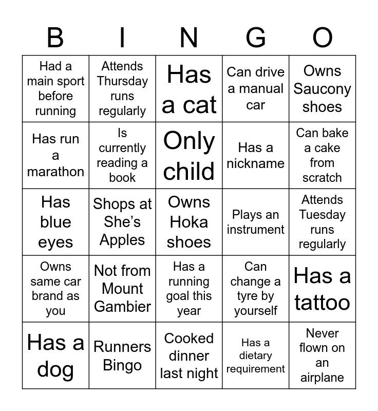 This bingo card has 62 words: Free!, Runners Bingo, Same birth month as you, Owns same car brand as you, Never flown on an airplane, Collects something, Is currently reading a book, Has broken a bone, Has a nickname, Has visited 3+ continents, Can drive a manual car, Has won a race, Has run a marathon, Got a parkrun PB in the past year, Has done 200 or more parkruns, Had a main sport before running, Owns Hoka shoes, Owns Saucony shoes, Drinks more than 2 coffees a day, Only child, Plays an instrument, Has a cat, Has a dog, Has a dietary requirement, Can ride a horse, Attended a concert this year, Doesn’t mind Brussels sprouts, First name has three vowels, Has a tattoo, Owns more than one car, Likes camping, Has been to the movies alone, Can tell you the colour of their socks without looking, Enjoys maths, Attends Tuesday runs regularly, Attends Thursday runs regularly, Has been a runner for 5 or more years, Has pet/s with name/s, Shops at She’s Apples, Has Goodr sunglasses, Has blue eyes, Has brown eyes, Not from Mount Gambier, From Mount Gambier, Can bake a cake from scratch, Can change a tyre by yourself, Likes flying in planes, Has a phobia, Has seen a snake in the past 6 months, Has a New Year’s resolution, Has a running goal this year, Cooked dinner last night, Drove here today, Has a sibling, Has more than one animal, Was good at running at school, Has a holiday planned for this year, Prefers tea over coffee, Prefers coffee over tea, Prefers pasta over pizza, Prefers pizza over pasta and Wears glasses.