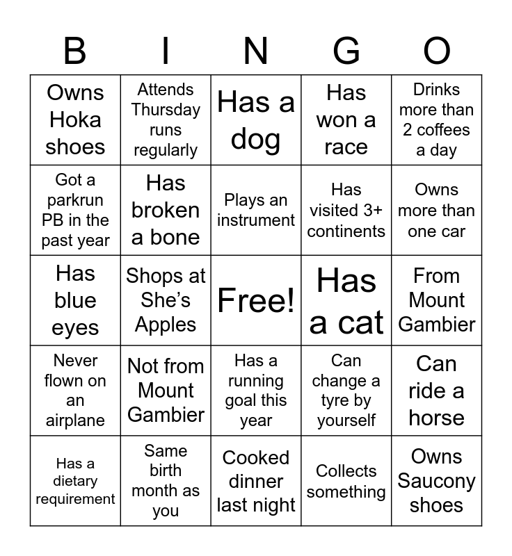 This bingo card has a free space and 61 words: Runners Bingo, Same birth month as you, Owns same car brand as you, Never flown on an airplane, Collects something, Is currently reading a book, Has broken a bone, Has a nickname, Has visited 3+ continents, Can drive a manual car, Has won a race, Has run a marathon, Got a parkrun PB in the past year, Has done 200 or more parkruns, Had a main sport before running, Owns Hoka shoes, Owns Saucony shoes, Drinks more than 2 coffees a day, Only child, Plays an instrument, Has a cat, Has a dog, Has a dietary requirement, Can ride a horse, Attended a concert this year, Doesn’t mind Brussels sprouts, First name has three vowels, Has a tattoo, Owns more than one car, Likes camping, Has been to the movies alone, Can tell you the colour of their socks without looking, Enjoys maths, Attends Tuesday runs regularly, Attends Thursday runs regularly, Has been a runner for 5 or more years, Has pet/s with name/s, Shops at She’s Apples, Has Goodr sunglasses, Has blue eyes, Has brown eyes, Not from Mount Gambier, From Mount Gambier, Can bake a cake from scratch, Can change a tyre by yourself, Likes flying in planes, Has a phobia, Has seen a snake in the past 6 months, Has a New Year’s resolution, Has a running goal this year, Cooked dinner last night, Drove here today, Has a sibling, Has more than one animal, Was good at running at school, Has a holiday planned for this year, Prefers tea over coffee, Prefers coffee over tea, Prefers pasta over pizza, Prefers pizza over pasta and Wears glasses.
