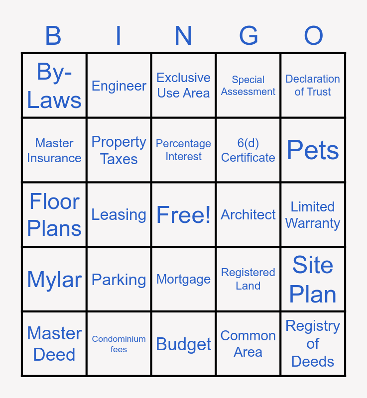 This bingo card has a free space and 24 words: Parking, Condominium fees, Percentage Interest, Master Deed, Declaration of Trust, By-Laws, Master Insurance, Engineer, Architect, Mortgage, 6(d) Certificate, Floor Plans, Registered Land, Site Plan, Property Taxes, Common Area, Limited Warranty, Exclusive Use Area, Pets, Leasing, Registry of Deeds, Mylar, Special Assessment and Budget.