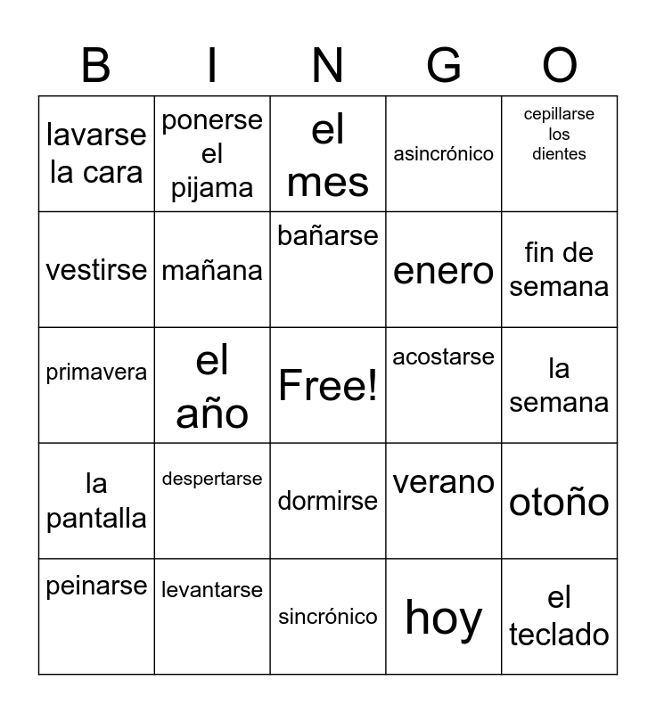 This bingo card has a free space and 24 words: despertarse, levantarse, bañarse, peinarse, cepillarse los dientes, lavarse la cara, vestirse, ponerse el pijama, acostarse, dormirse, enero, primavera, verano, otoño, mañana, hoy, la semana, el mes, fin de semana, el año, el teclado, la pantalla, asincrónico and sincrónico.