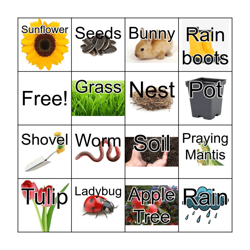 This bingo card has 15 images and 16 words: Ladybug, Praying Mantis, Bunny, Sunflower, Shovel, Seeds, Soil, Apple Tree, Free!, Grass, Tulip, Rain boots, Worm, Pot, Nest and Rain.