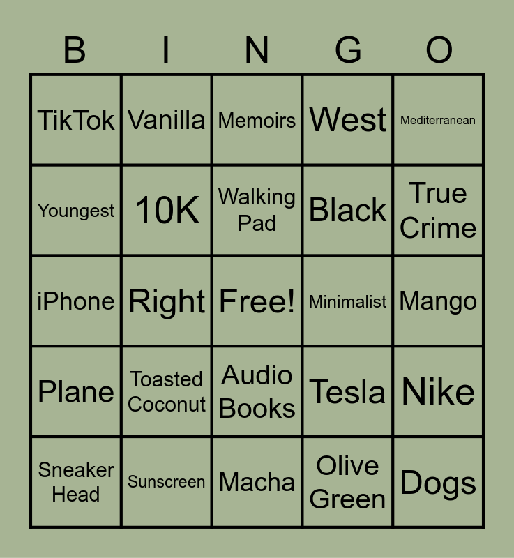 This bingo card has a free space and 24 words: Toasted Coconut, Sunscreen, Walking Pad, Sneaker Head, Mediterranean, TikTok, Youngest, Vanilla, Minimalist, Audio Books, Black, iPhone, Tesla, Nike, 10K, Olive Green, Mango, Memoirs, True Crime, Right, Dogs, Plane, West and Macha.