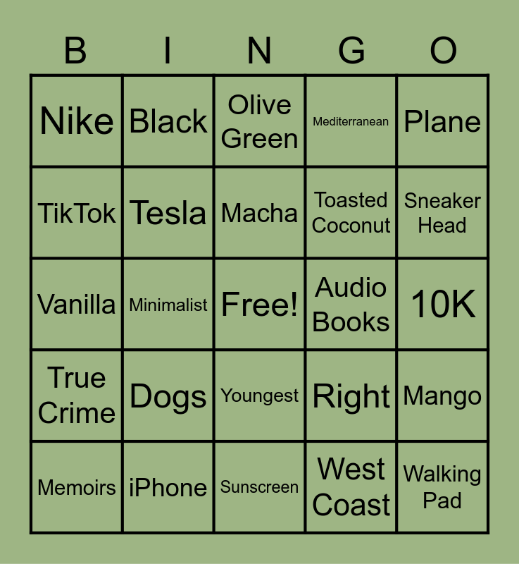 This bingo card has a free space and 24 words: Dogs, iPhone, Macha, Memoirs, Plane, Nike, TikTok, Black, Audio Books, Youngest, Toasted Coconut, Vanilla, Right, Mango, Tesla, West Coast, 10K, Olive Green, Sneaker Head, Minimalist, Walking Pad, True Crime, Mediterranean and Sunscreen.